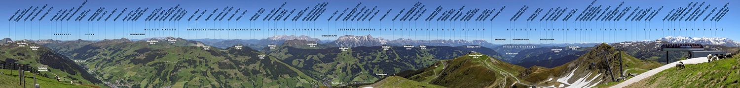 Panorama der Woche: Schattberg Westgipfel, Kitzbüheler Alpen. 270°-Panorama, aufgenommen im Frühjahr 2025.Durch die Wahl des Aufnahmestandpunktes sind alle Gipfel der umliegenden Berge im Blickfeld.Weitere Panoramablicke von Alpengipfeln auf die umliegende Bergwelt, mit Beschriftung der wichtigsten Gipfel und Talorte finden Sie nach Region oder nach Gipfelname aufgelistet. Ebenso beeindruckende Panoramen von bekannten Städten und touristischen Highlights sowie sehenswerten Aussichtspunkten. Alles aufgenommen in höchster Auflösung für Einsätze in -zig Metern Breite!