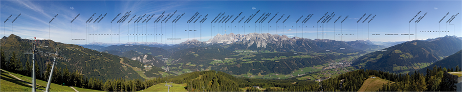 180°-Panorama von der Bergstation der Hochwurzen-Bahn mit Blick auf Dachsteingebirge und Ennstal. Foto: C. Schickmayr