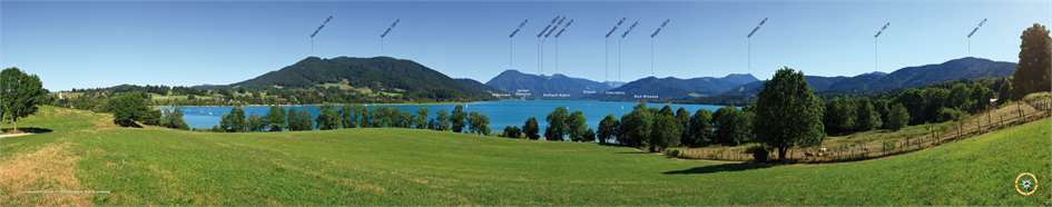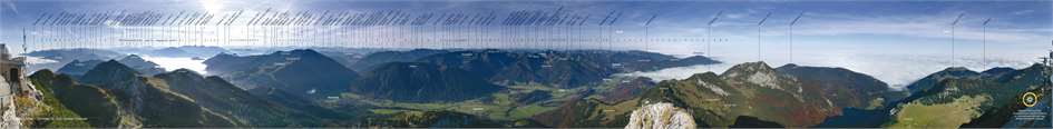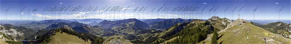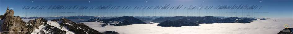 Panoramafoto: 180°-Panorama Foto vom Gipfel des Wendelstein in extremer Detailgenauigkeit. Das Bild entstand aus 80 Einzeilaufnahmen, aufgenommen mit 150 mm Brennweite. Der Rundblick reicht vom Hochries über die Chiemgauer und Berchtesgadener Alpen, Kaisergebirge, Loferer und Leoganger Steinberge, Glockner- und Venedigergruppe bis zum Karwendel und dem Wettersteingebirge mit der Zugspitze. Durch die extrem hohe Auflösung sind Vergrößerungen in mehreren Metern Breite gestochen scharf möglich! Fotografie, Gestaltung und Gipfelbeschriftung: Christian Schickmayr