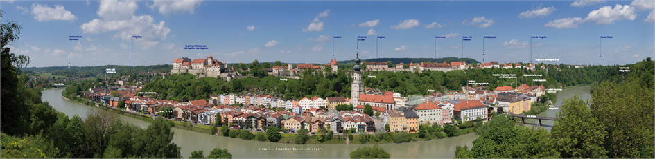 150°-Panorama über die Stadt Burghausen an der Salzach mit der weltlängsten Burg mit Beschriftung der Sehenswürdigkeiten. Das Foto ist auch ohne Beschriftung erhältlich. Foto: C. Schickmayr