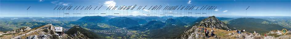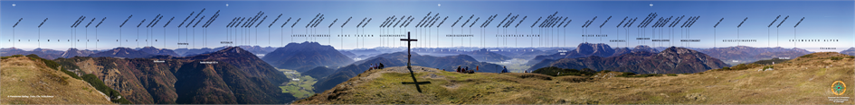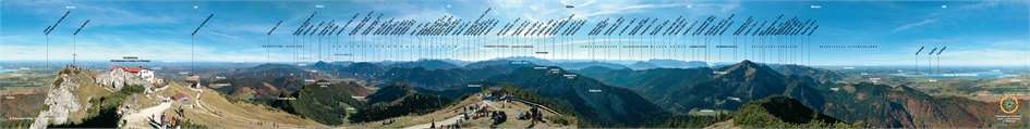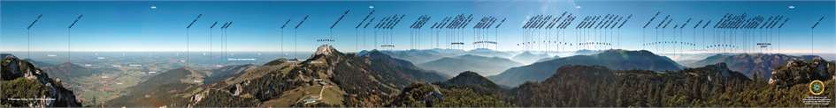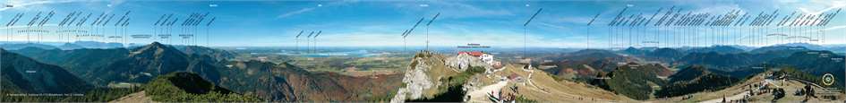 Panoramafoto: 360°-Blick von der Kampenwand, einem beliebten Ausflugsgipfel in den Chiemgauer Alpen. Das Bild zeigt den Blick auf den Chiemsee, dem Bayerischen Meer sowie im Uhrzeigersinn die Alpen, von der Kampenwand über Untersberg, Steinernes Meer, Hohe Tauern zum Kaisergebirge, weiter zu den Bayerischen Voralpen mit Geigelstein und Wendelstein, im Hintergrund die Tuxer Alpen und das Karwendelgebirge. Fotografie: Kurt Leininger, Gestaltung und Gipfelbestimmung: Christian Schickmayr.