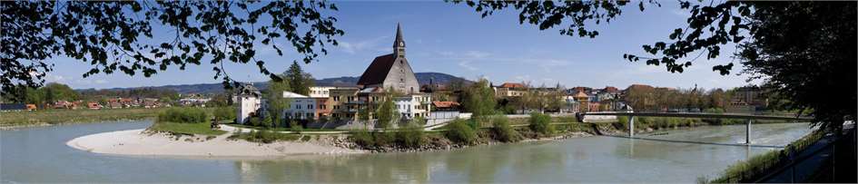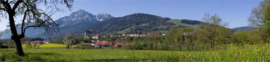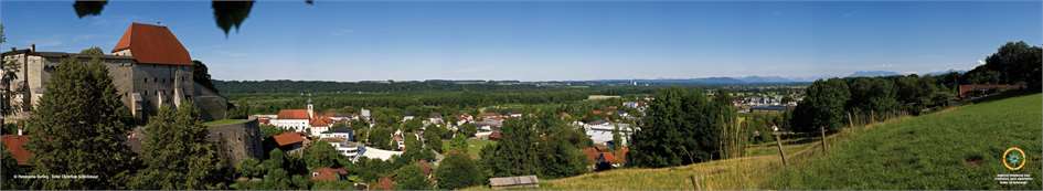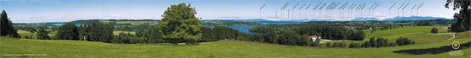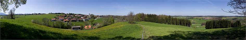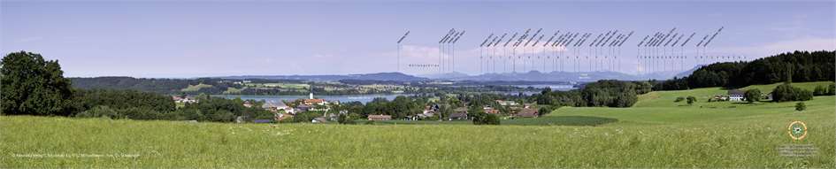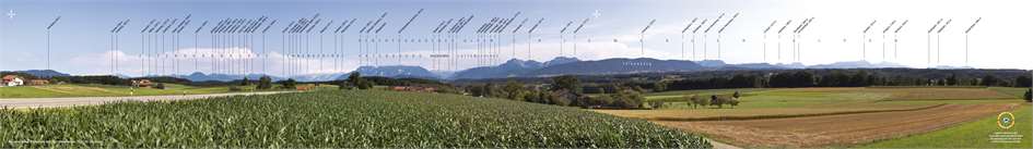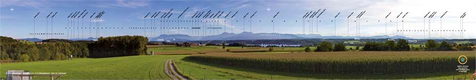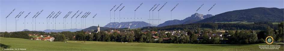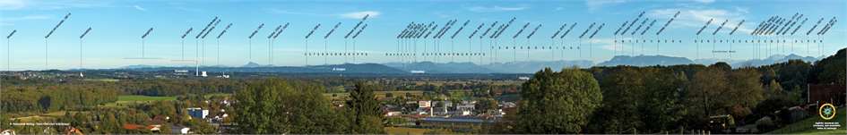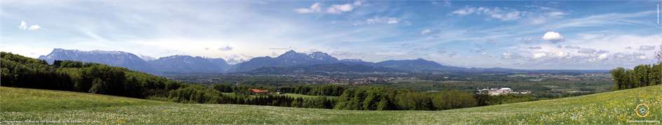 Panoramafoto: 180° Panorama, aufgenommen vom Voggenberg bei Anthering auf die Berchtesgadener und Chiemgauer Alpen. Der Blick reicht vom Untersberg auf Staufen und Zwiesel, Teisenberg und die schon weiter entfernten Bayerischen Voralpen. Vor dem Staufen liegt im Tal die Stadt Freilassing. Wie alle Panoramen in unserem Verlag wurde auch dieses Bild aus zahlreichen Einzelfotos zu einem nahtlosen Rundblick gestitcht, die Dateigröße erlaubt Ausdrucke in nahezu beliebigen Größen.