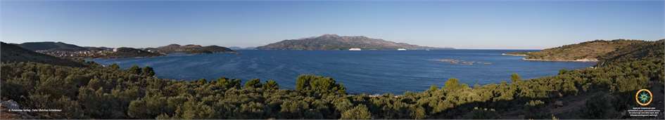180°-Panoramablick von Ksamil südlich von Saranda (Sarande) auf die Insel Korfu (inkl. Minoan und Anek-Line). Foto: C. Schickmayr