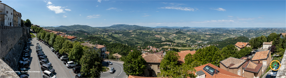 Panoramafoto: 180° Panorama Foto über die hügelische Landschaft im Westen der Felsenstadt San Marino. Aufgenommen vom Parkplatz am Nordende der Stadt. Das Panorama wurde aus mehreren Einzelfotos gestitcht und erlaubt Vergrößeringen mehreren Metern Breite. Fotografie und Gestaltung: Christian Schickmayr.