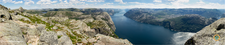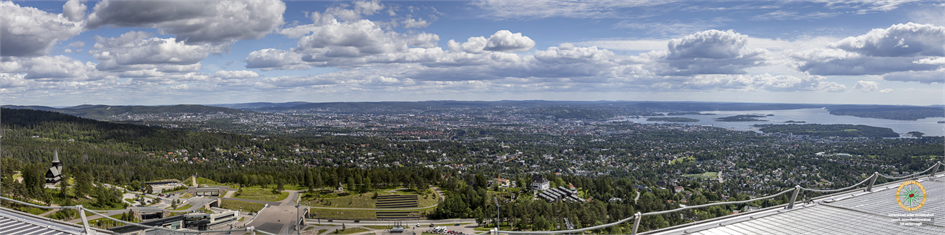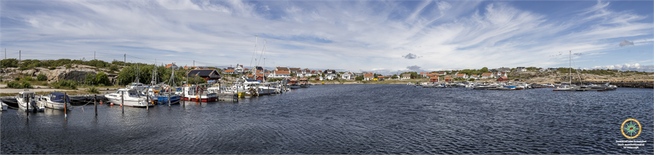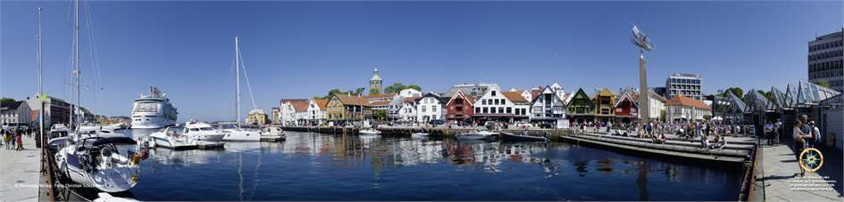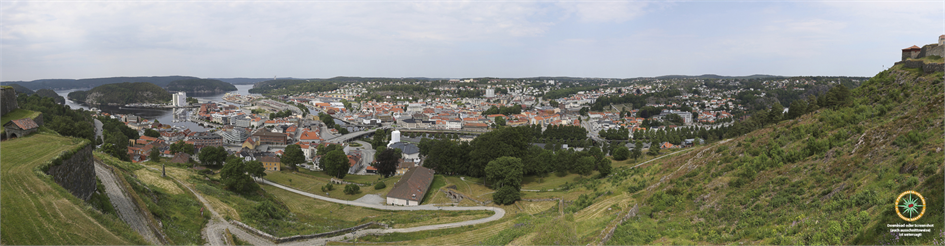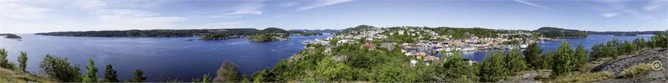 Panoramafoto: 270° Blick von einem eher schwierig zugänglichen Aussichtsfelsen inmitten von Kragerø. Die Siedlung war früher ein kleines Fischerdorf in der Schärenlandschaft zwischen Oslo und Kristiansand, ist heute ein beliebter Touristenort mit zahlreichen Restaurants und Beherbergungsbetrieben. Die vorgelagerten Inseln werden regelmäßig mit Fährschiffen angelaufen. Das Bild zeigt von links nach rechts den gesamten Ort samt seinen vorgelagerten Inselchen und den darauf befindlichen Siedlungen. Fotografie, Gestaltung und Beschrifrtung: Christian Schickmayr