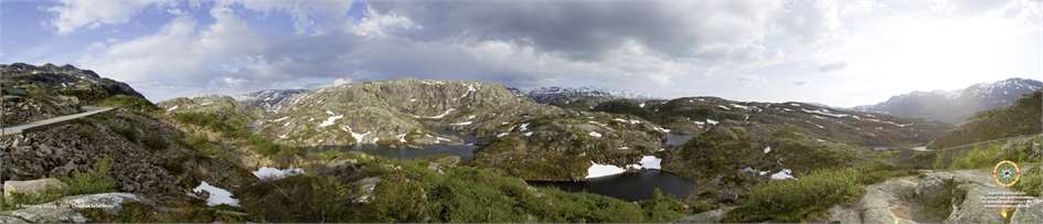 270°-Blick über die wilde Gebirgslandschaft zwischen Sauda und Røldal mit Blick auf den Skavlen (Skaulen). Die Aufnahme entstand im Juni 2016 nach einer langen Schönwetterphase. Bis zu 7 Meter hohe Schneestangen verraten, wie es hier in harten Wintern zugeht. Die rund 40 km lange Strecke zwischen Sauda und Røldal ist kurvig und sehr einsam, zu dieser Jahreszeit ist man dort alleine.