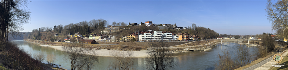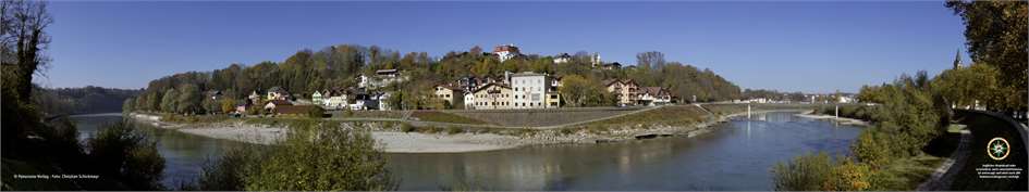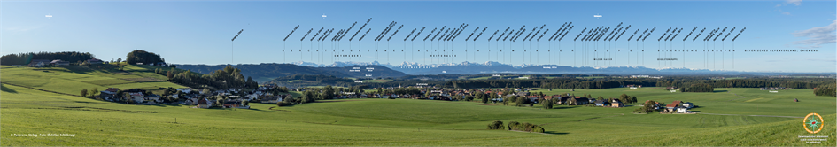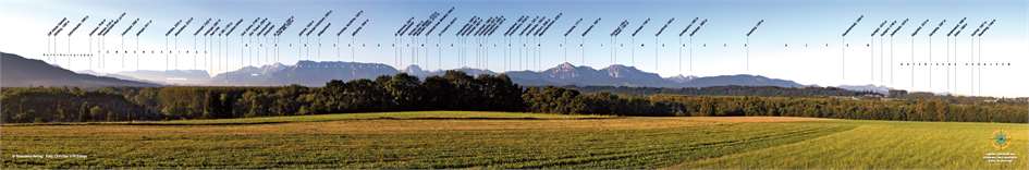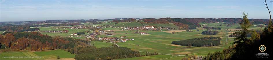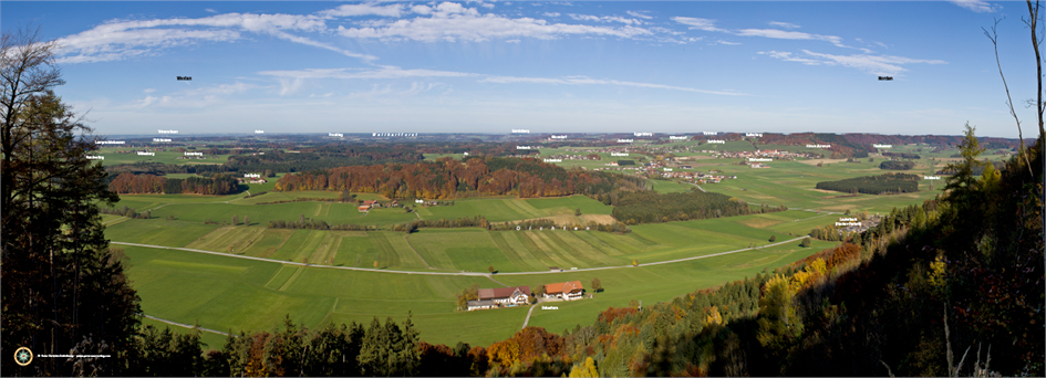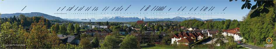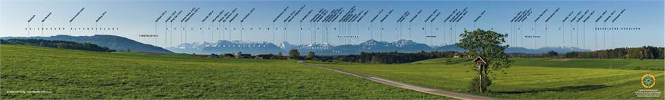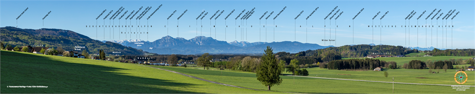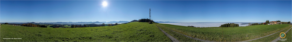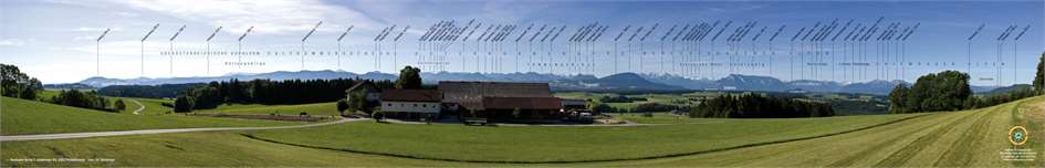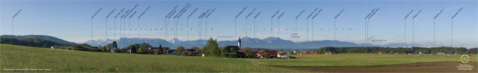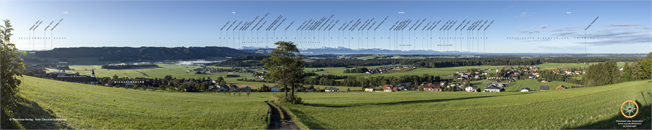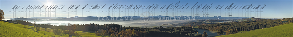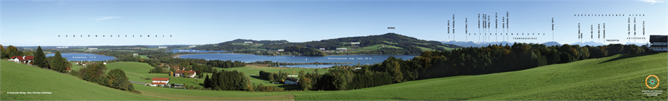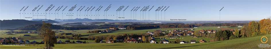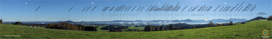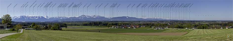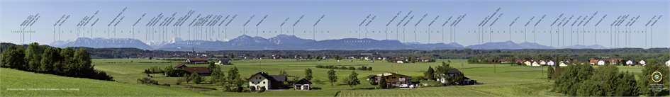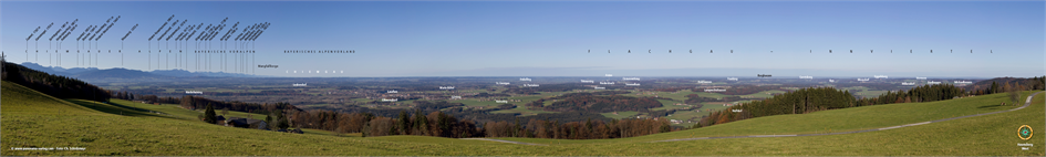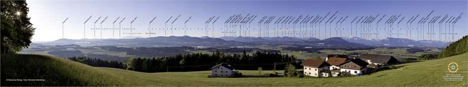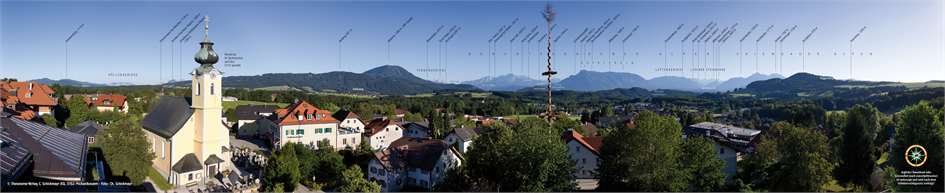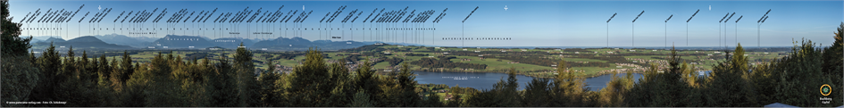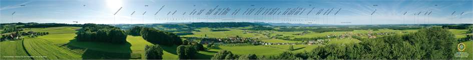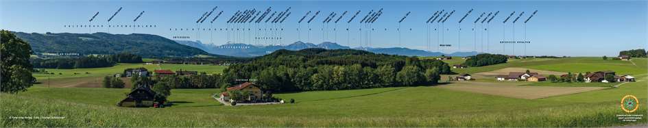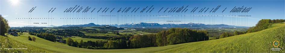Panoramafoto: 360° Panorama, aufgenommen vom "Lielon", einem Aussichtsberg in Michaelbeuern, an der Grenze von Salzburg-Land und Innviertel. Der Rundblick zeigt im Norden ins Innviertel, geht im Uhrzeigersinn über die Salzkammergutberge zur Osterhorngruppe, Tennengebirge und Berchtesgadener Alpen mit dem Untersberg. Im Vordergrund dominiert hier der lange Rücken des Haunsberges. Weiter im Rundblick dann die Chiemgauer Alpen mit dem markanten Staufen und Zwiesel, im Hintergrund der Wilde Kaiser. Ganz rechts im Bild die Kampenwand und der Wendelstein und weiter in das flachere Gebiet des Chiemgaues und des Bayerischen Alpenvorlandes.