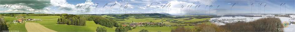 Die Besonderheit an diesem Bild ist die nahtlose Montage der 4 Jahreszeiten. Vom gleichen Standpunkt aus wurde der komplette 360°-Rundblick über das Jahr verteilt 4 x aufgenommen und in Photoshop gesticht. Jeder einzelne Rundblick besteht aus 30 Einzelaufnahmen. Fotografie und Gipfelbestimmung: Christian Schickmayr.
