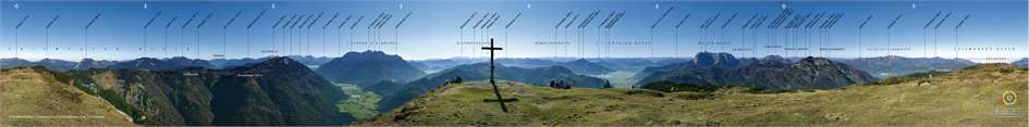 Panoramafoto: 360°-Blick vom Gipfel des Fellhorns, dem südlichsten Eckpfeiler der Chiemgauer Alpen. Ein Aussichtsberg ersten Ranges, wie dieses Panorama zeigt. Der Blick auf diesem Panorama, das aus 64 Einzelaufnahmen gestitcht wurde, beginnt links bei Hochgern und Hochfelln, führt über die Berchtesgadener Alpen zu den Loferer Steinbergen und gen Süden zu den Hohen Tauern mit Glocknergruppe und über den Venediger zu den Zillertaler Alpen. Im Tal liegt St. Johann in Tirol, eingerahmt von Kitzbüheler Horn und Hahnenkamm. Rechts im Vordergrund der Wilde Kaiser, Zahme Kaiser und Geigelstein, ganz im Westen die Kampenwand und das unter dem Nebelmeer liegende Bayerische Alpenvorland. Fotografie und Gipfelbestimmung: Christian Schickmayr.