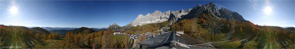 Panoramafoto: 360°-Blick, aufgenommen vom Dach der Türlwandhütte bei der Talstation der Dachstein-Seilbahn. Der Rundblick führt über die Niederen und Hohen Tauern mit Glockner- und Venedigergruppe zum Rötelstein und zu den Südwänden des Hohen Dachsteins. Das Panorama wird im Auftrag der Türlwandhütte für einen personalisierten Panorama-Guide angefertigt. Ein weitere Panoramablick von der Terrasse Richtung Süden ist ebenfalls hier verfügbar.