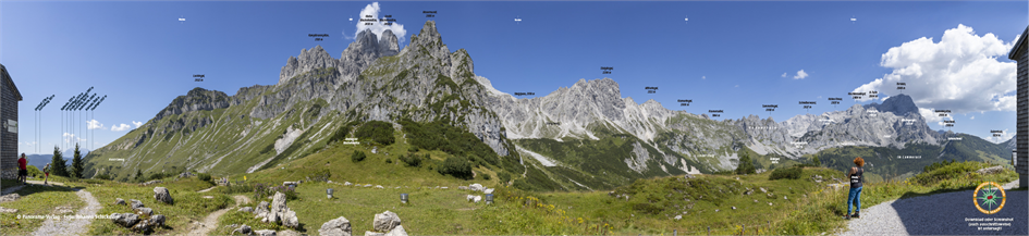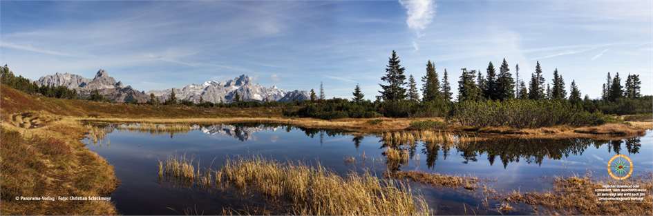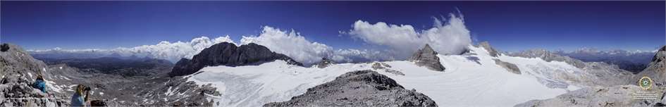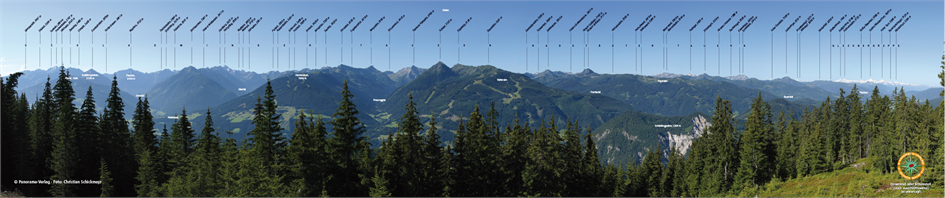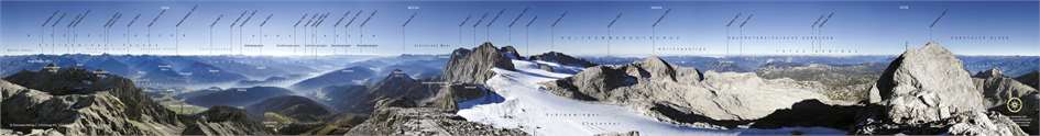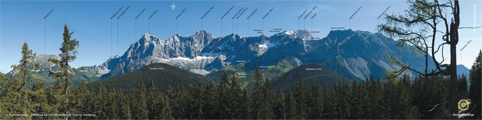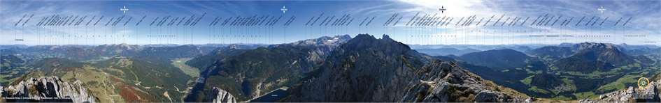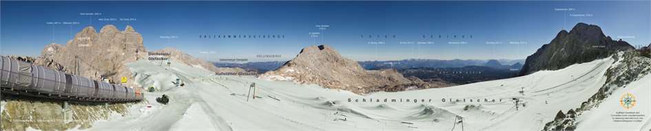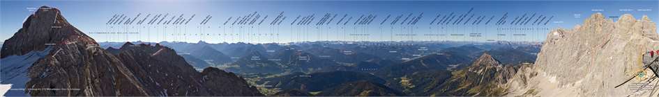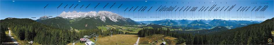 Panoramafoto: Blick vom Gipfel des Rittisberges auf die Südwände des Dachstein-Hauptmassives mit Torstein, Mitterspitze und Hoher Dachstein. Das Bild in extremer Detailschärfe zeigt neben den Gipfeln und Almen unterhalb der Südseite des Dachsteines auch dessen wichtigstste Klettersteige. Vom gleichen Standpunkt wurde auch der Blick Richtung Süden aufgenommen und ist ebenfalls hier erhältlich. Fotografiert wurden die Panoramen für Schautafeln, die vor Ort aufgestellt sind. Fotografie und Gipfelbestimmung: Christian Schickmayr.