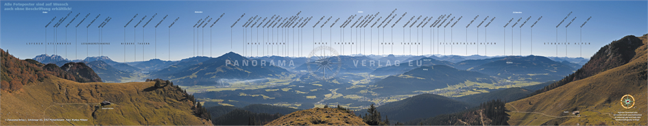 Panoramafoto: 180° Panorama, aufgenommen vom Wilden Kaiser bei der Ackerlhütte. Der Blick reicht von den Loferer und Leoganger Steinbergen über die Hohen Tauern bis zu den Zillertaler und Stubaier Alpen. Der imposante Tiefblick nach Fieberbrunn und Kitzbühel ist ungetrübt. Das Bild wurde in höchster Auflösung für eine Schautafel erstellt, die am Fotostandpunkt aufgestellt ist. Vergrößerungen in mehreren Metern Breite möglich.