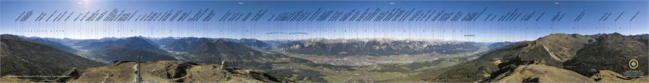 Panoramafoto: 180°-Panorama von Vomperberg am Fuße des Karwendelgebirges auf das Inntal bei Schwaz mit Blick auf die Tuxer Alpen. Die Stubaier Alpen sind rechts im Bild noch zu erkennen. Das Bild wurde für eine Schautafel angefertigt, die am Fotostandpunkt aufgestellt ist. Die hohe Auflösung erlaubt Vergrößerungen in mehreren Metern Breite. Fotografie: Markus Mitterer, Gestaltung und Gipfelbeschriftung: Christian Schickmayr