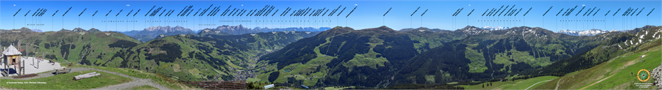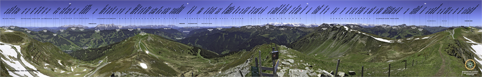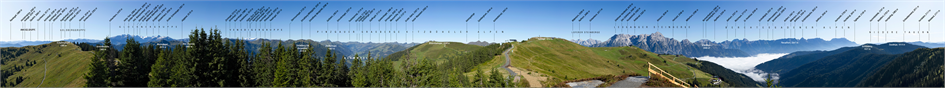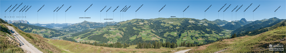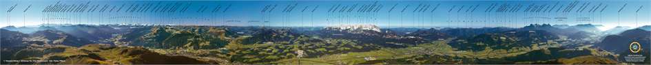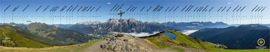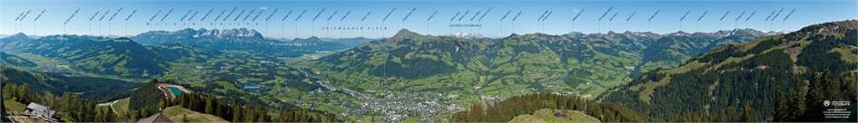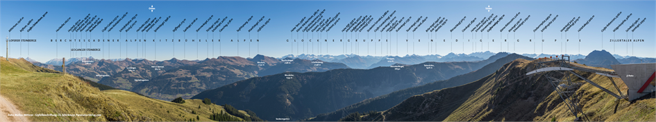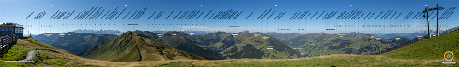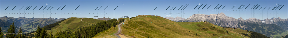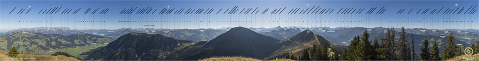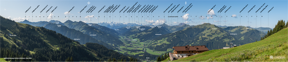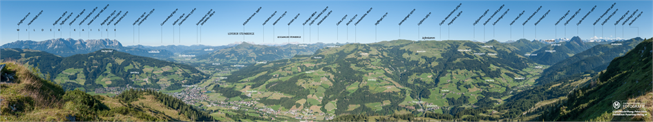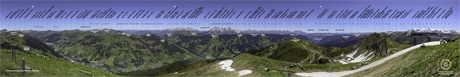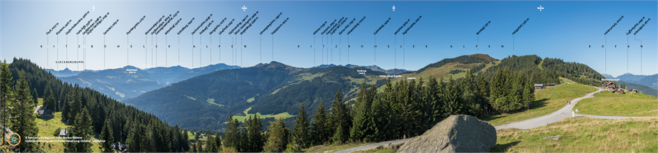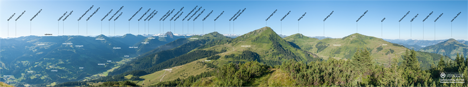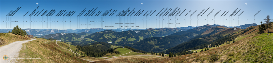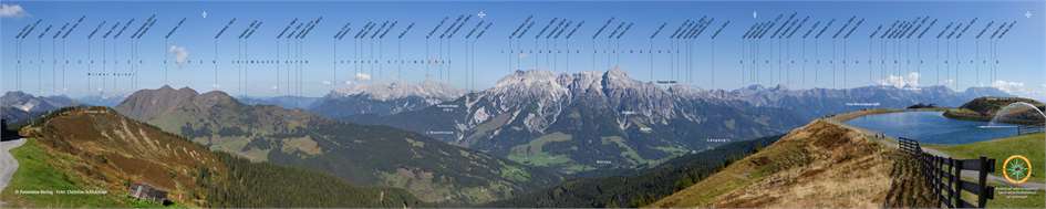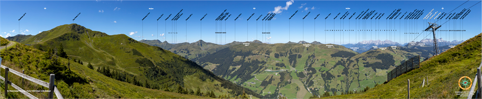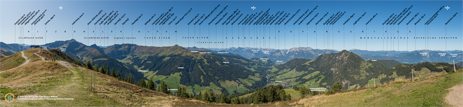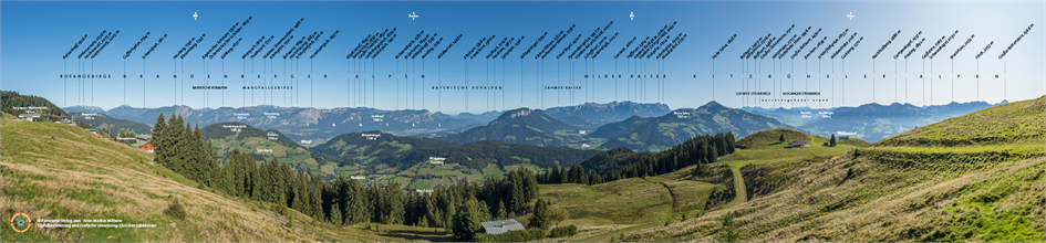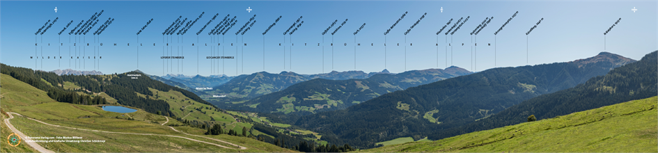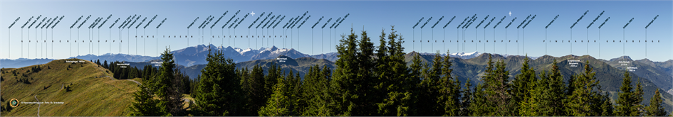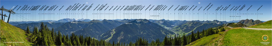 Panoramafoto: ca. 180° Panorama, aufgenommen am Schatzberg, Wildschönau, nahe Hopfgarten im Brixental in den Kitzbüheler Alpen für eine Schautafel, die am Aufnahmestandpunkt aufgestellt ist. Entsprechend hochaufgelöst wurde die Datei erstellt, die Datenmenge reicht für Vergrößerungen in mehreren Metern Breite. Fotografie: Markus Mitterer, Gipfelbestimmung: Christian Schickmayr.