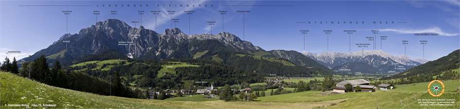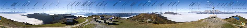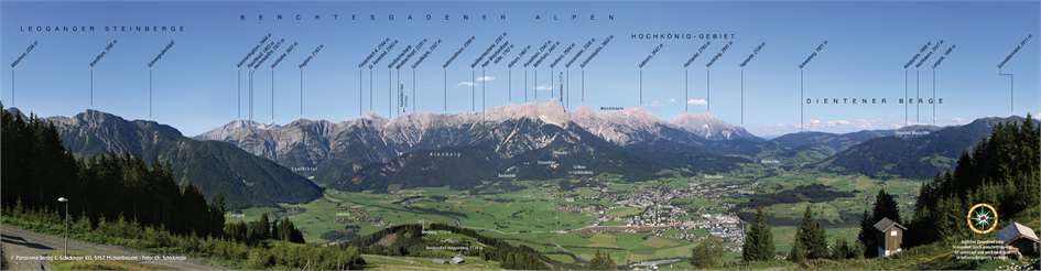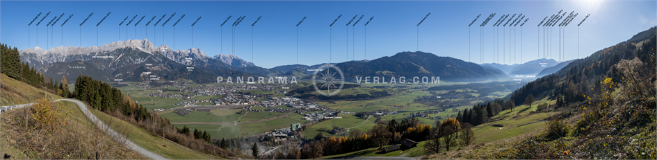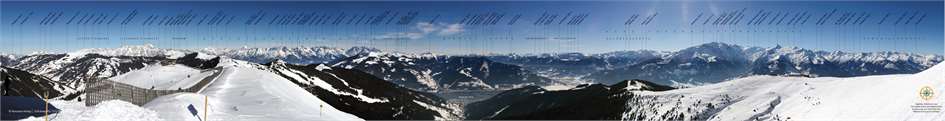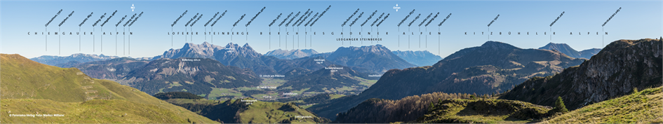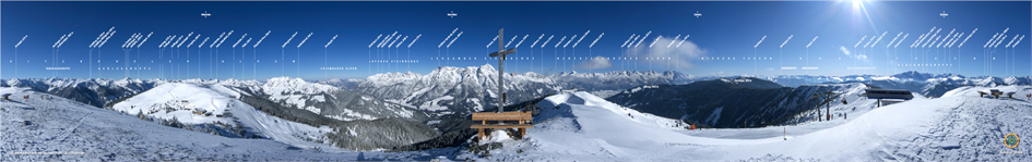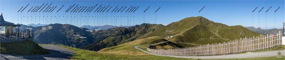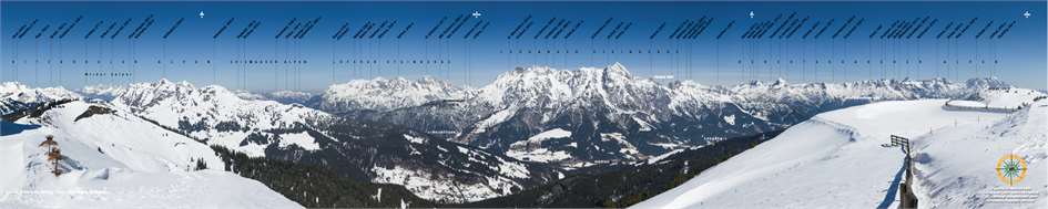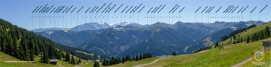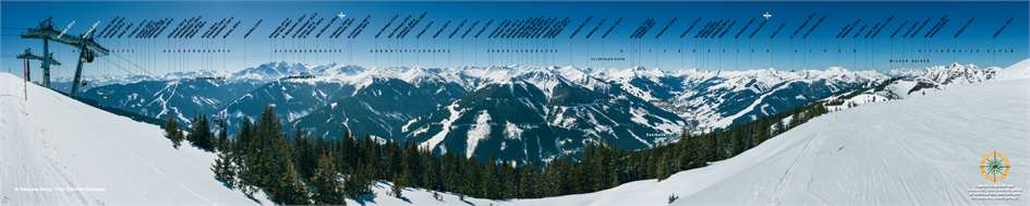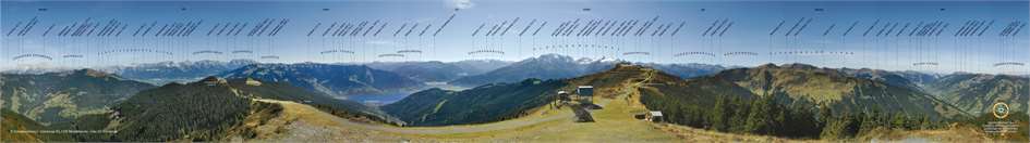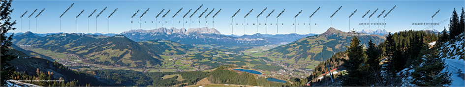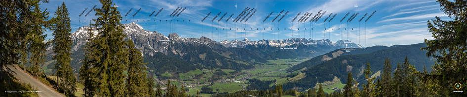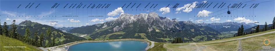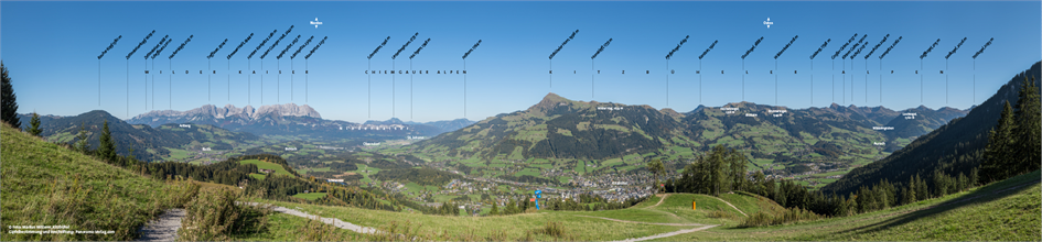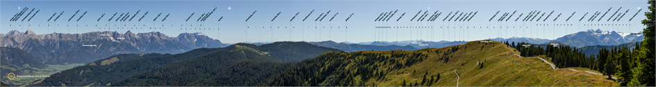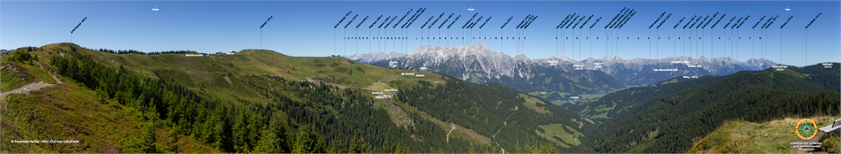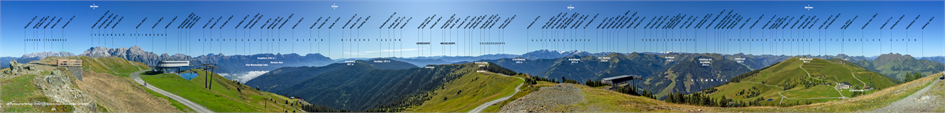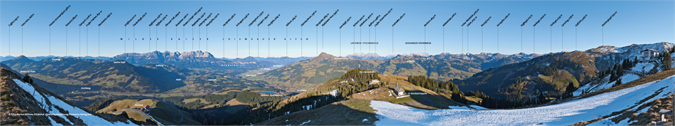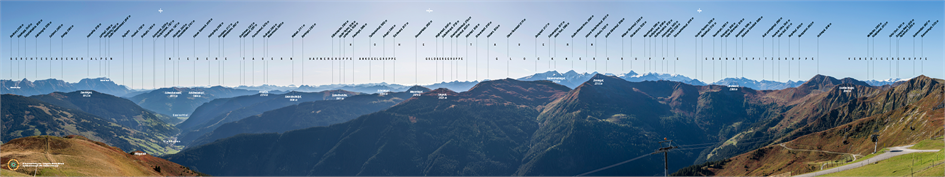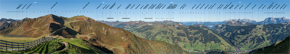 Panoramafoto: ca. 180° Panorama, aufgenommen am Schatzberg, Wildschönau, nahe Hopfgarten im Brixental in den Kitzbüheler Alpen für eine Schautafel, die am Aufnahmestandpunkt aufgestellt ist. Entsprechend hochaufgelöst wurde die Datei erstellt, die Datenmenge reicht für Vergrößerungen in mehreren Metern Breite. Fotografie: Markus Mitterer, Gipfelbestimmung: Christian Schickmayr.