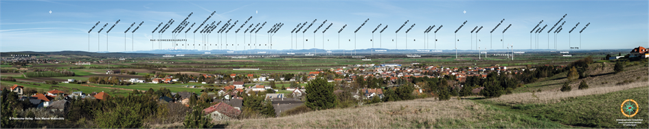Panoramafoto: ca. 200°-Panorama, aufgenommen von einer Anhöhe oberhalb von Hof am Leithaberge. Das Fotos wurde in mehreren Einzelaufnahmen erstellt und vom Panorama-Verlag gestitcht. Verwendungszweck Schautafel am Fotostandpunkt. Fotografie: Werner Wukoschitz, Reproduktion und Gipfelbestimmung: Christian Schickmayr.