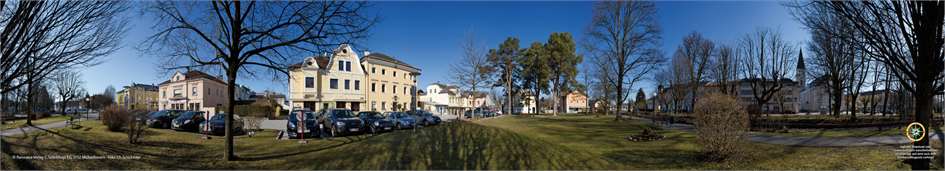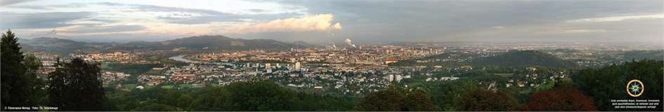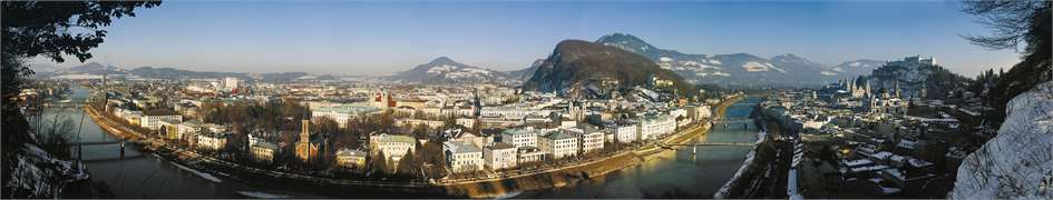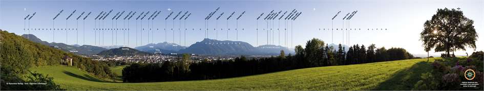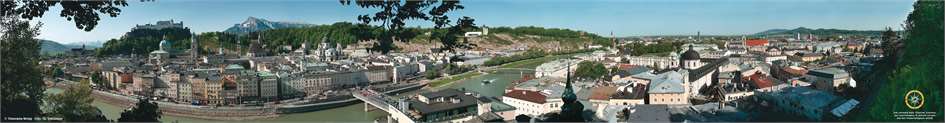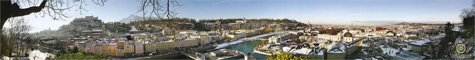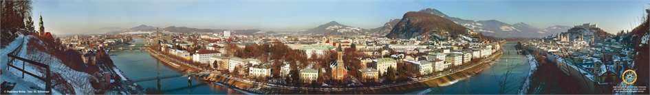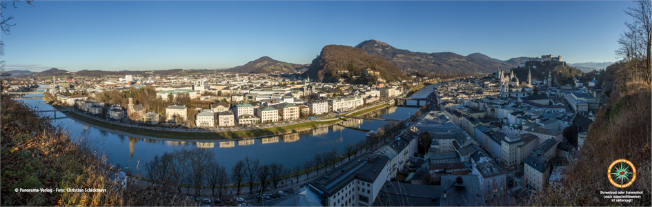 Panoramafoto: 270°-Rundblick, aufgenommen vom Kapuzinerberg auf das Zentrum der Festspielstadt Salzburg. Das Bild wurde von zwei verschiedenen Standpunkten aufgenommen und im Computer aus insgesamt 30 Einzelfotos gestitcht. Dadurch wurde dieser einzigartige Rundblick erst möglich. Extreme Auflösung, Drucke bis 10 Meter Breite wurden bereits gestochen scharf produziert. Der Blick reicht vom Stift Nonnberg bis nach Maria Plain. Im Hintergrund das Tennengebirge, hinter der Festung liegt der Untersberg. Alle Sehenswürdigkeiten im Bild sind markiert und ausführlich beschriftet. Foto: C. Schickmayr