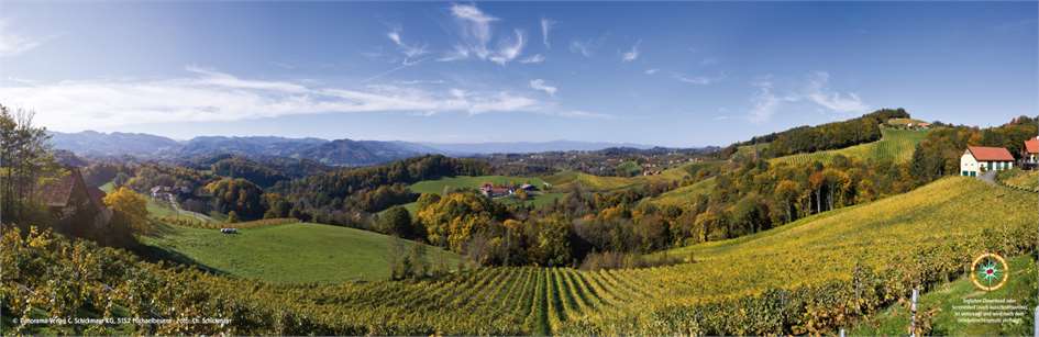 Panoramafoto: ca. 150° Panorama, aufgenommen im Bereich der Südsteirischen Weinstraße, zwischen Leutschach und Gamlitz im Herbst 2015. Fotografie und Gestaltung: Christian Schickmayr. Bild ohne Beschriftung!