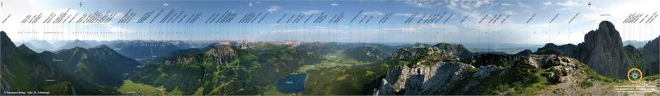 Panoramafoto: 360°-Blick vom Gipfel der Roten Flüh, 2108 m, Tannheimer Berge. Der Rundblick reicht im Uhrzeigersinn vom Wettersteingebirge über die Mieminger Kette zu den Nordtiroler Kalkalpen. Weiter zu den Lechtaler Alpen, im Vordergrund die Liegfeistgruppe. Im Südwesten blickt man in die Allgäuer Alpen, zu Füßen liegt das Tannheimer Tal mit dem Haldensee. Ganz im Nordosten blickt man hinunter in das Bayerische Alpenvorland in die Region Füssen. Fotografie, Gestaltung und Gipfelbeschriftung: Christian Schickmayr