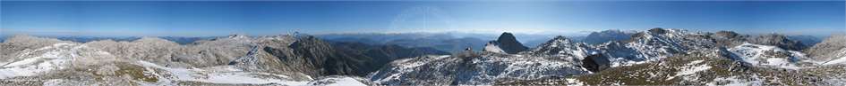 Panoramafoto: 360°-Blick vom Gipfel des Streitmandels im Herzen des Tennengebirges. In der linken Bildhälfte schaut die Osterhorngruppe etwas hervor, in der Bildmitte throhnt der Dachstein. Rechts im Bild die Edelweißhütte, eine Selbstversorger-Unterkunft mit wenigen Schlafplätzen.