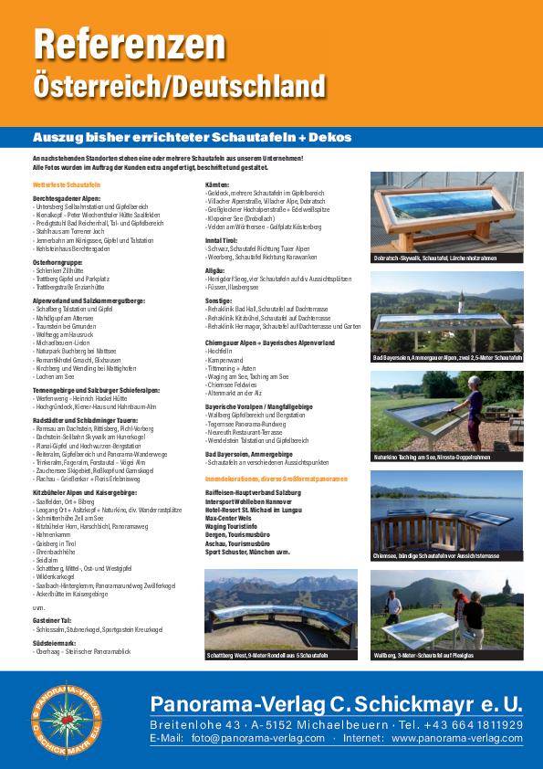 Panorama-Schautafeln auf Aussichtspunkten der Alpen, auf Gipfeln oder bei Hütten, aber auch in städtischen Bereichen erfreuen sich immer mehr an Beliebtheit bei Wanderern, Bergsteigern und Touristen. Alles zu sehen, alles zu kennen, was im Blickfeld liegt, steckt in der natürlich Neugierde der Menschen. Jeder, der schon einmal auf einem Gipfel mit herrlichem Ausblick gestanden ist, hat sich sicher schon die Frage nach den Namen der Berge oder von Gebirgsgruppen gestellt. Auch auf Aussichtspunkt von Städten schätzt man die Informationen über Sehenswürdigkeiten und markanten Gebäuden. Unser Verlag stellt Panorama-Schautafeln ausschließlich auf fotografischer Basis her. Mit höchster Detailschärfe durch spezielle Festbrennweiten-Objektive digital erstellt, sorgfältig gestitcht und ausführlich beschriftet sind Panorama-Schautafeln ein Publikumsmagnet und auch ein idealer Werbeträger.