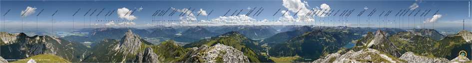 Panoramafoto: 360°-Blick vom Gipfel der Kellespitze, Tannheimer Berge.