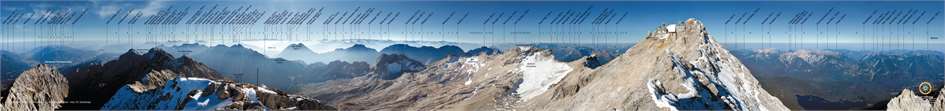Panoramafoto: 360° Panorama, aufgenommen vom Jubiläumsgrat einige hundert Meter unterhalb des Gipfelaufbaues der Zugspitze. Der Blick beginnt im Osten beim Estergebirge, im Tal liegt Garmisch-Partenkirchen, weiter im Uhrzeigersinn ins Karwendelgebirge zu Stubaier und Ötztaler Alpen, in der Ferne das Engadin und die Silvretta Gruppe. Im Westen liegen Lechtaler und Allgäuer Alpen, teilweise verdeckt von der Zugspitze, rechts daneben dann das Ammergebirge im Norden.