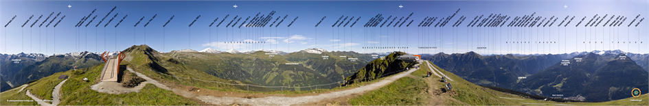 Im 360°-Panoramafoto, aufgenommen vom Gipfel des Stubnerkogel, (2246 m), wurden alle wichtigen Gipfel mit Namen und Höhe sowie Talorte eingezeichnet. Der Rundblick in extremer Detailschärfe, aufgenommen bei herrlichem Wetter mit excellenter Fernsicht, bietet einen einzigartigen Blick auf die umliegende Bergwelt.